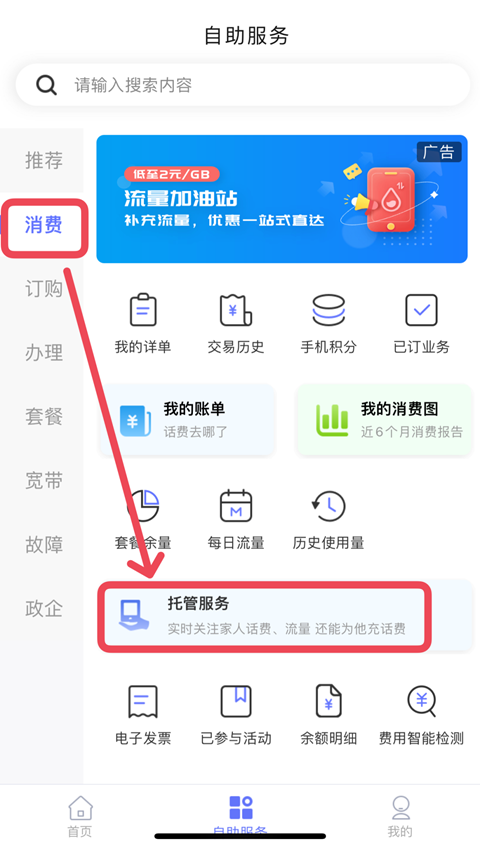 1、下载登录10000社区进入自助服务-消费-托管服务。