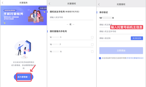 2、点击“成为管理者”输入托管号码(套内或套外单手机卡)和托管号码机主的证件号、验证码验证通过后绑定如号码A管控号码B的上网功能,号码A登录10000社区,在托管服务中输入或选择号码B,并输入号码B机主的姓名、身份证号码、验证码进行验证绑定。