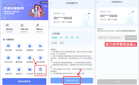 托管号码开通流量包等服务,可自动激活数据上网功能。