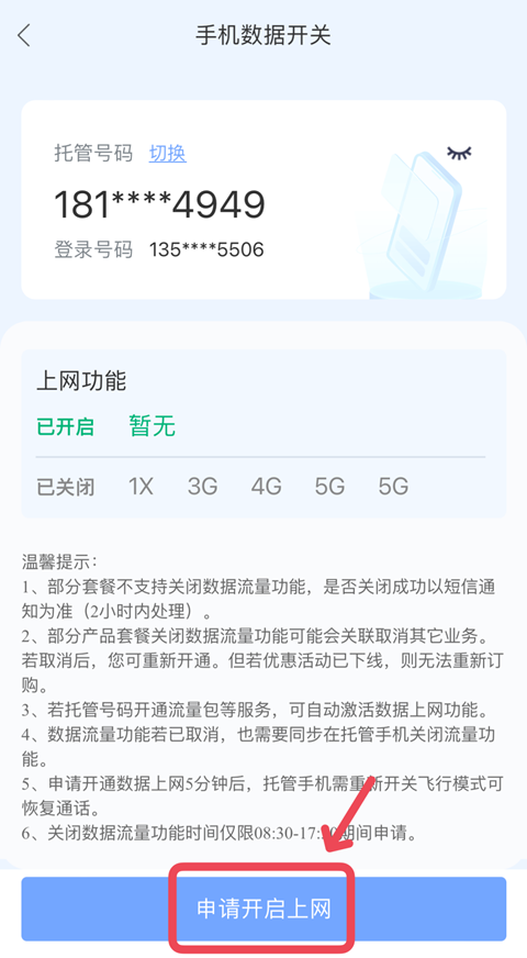 4、点击确认“申请开启上网”5分钟后重启手机或开关飞行模式即可恢复上网功能。