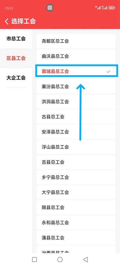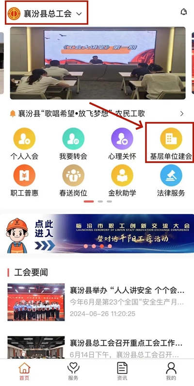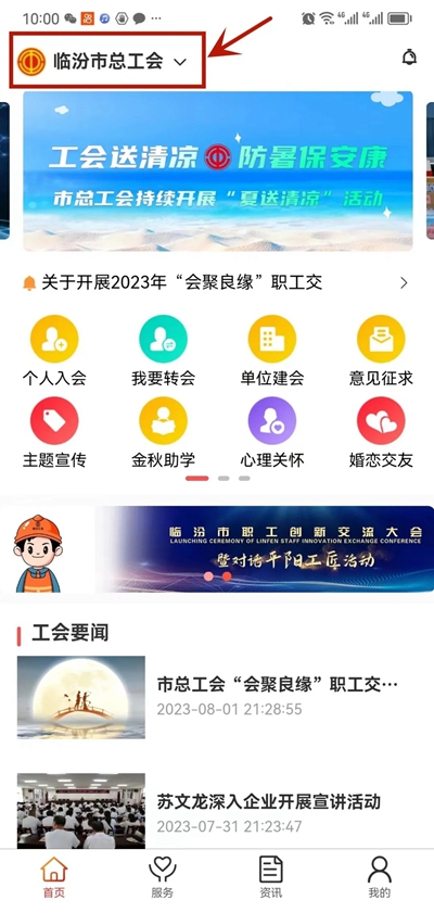 1、下载安装临汾市总工会APP,点击切换为到当地的工会 ,比如乐乐游戏小编这里的翼城县总工会。