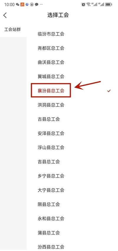 1、下载安装临汾市总工会APP,点击切换所在,这里小编随便选一个作为演示。