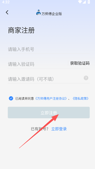 1、万师傅企业版商家注册,请点击首页登录页面的注册。