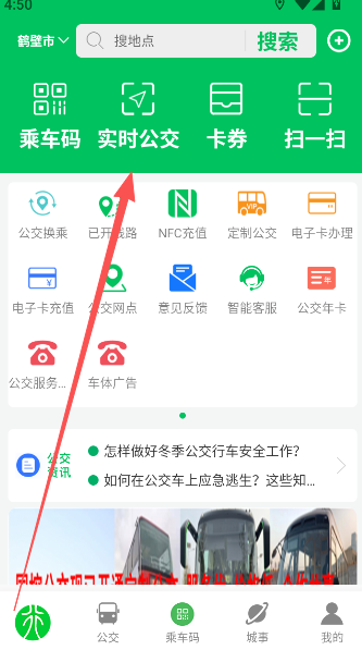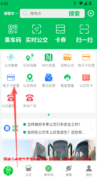 1、鹤壁行公交卡出行可点击首页上方功能栏目内的电子卡充值。