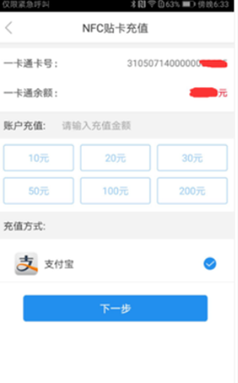 4、在贴卡充值界面输入充值金额,点击下一步进入到支付页面。