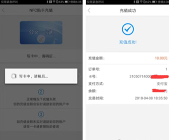 6、在写卡界面将卡移开,再次贴到手机NFC位置。系统会自动读取卡片信息,进行写卡操作。当写卡结束后,系统进入充值成功界面。