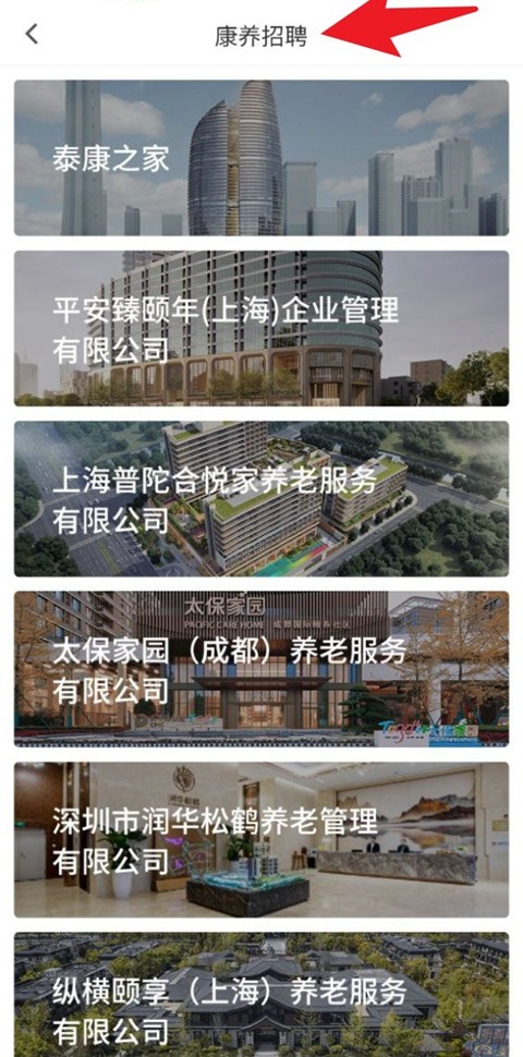 2、选择其中一个企业招聘分类后,页面会展示康养行业的招聘公司列表,点击任意公司卡片进入详情。