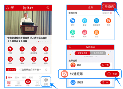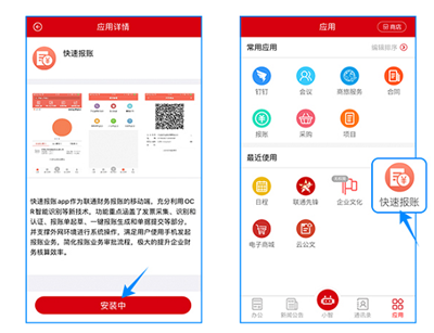 第四步:下载并安装成功,返回“应用”页面,在页面找到“快速报账”,点击进入报账即可。