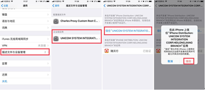 5、苹果手机特别提示:若页面提示“未受信任的企业级开发者”,打开手机设置->通用->描述文件与设备管理->企业级应用->点击 “信任“UNICOM......”-> [信任]。