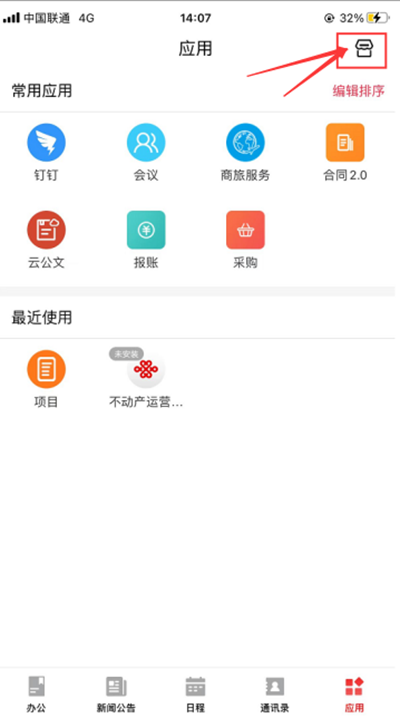 4、 打开“应用”页面,点击“右上角”应用图标,进入应用商店,输入“不动产运营”进行搜索。