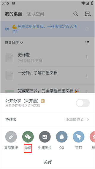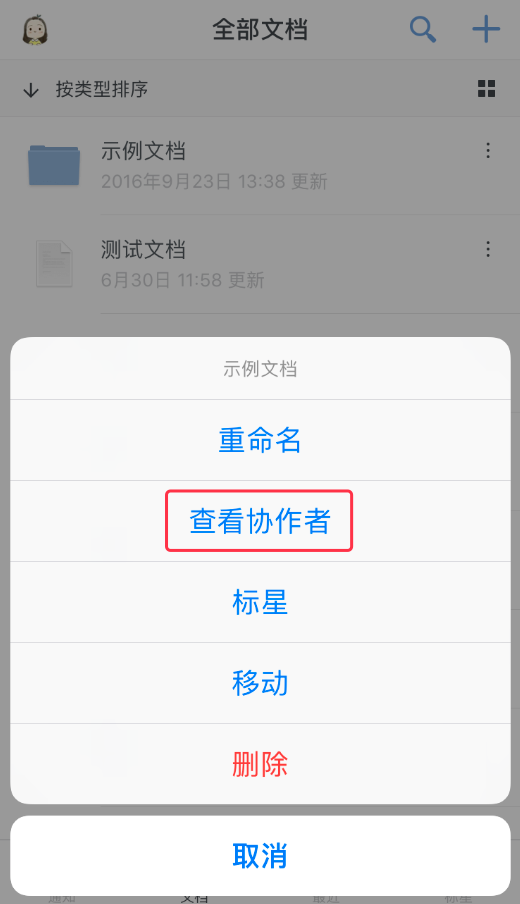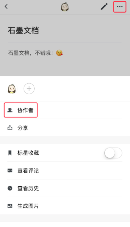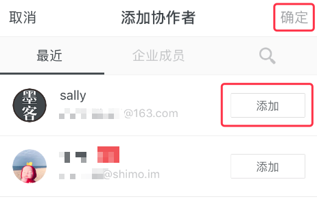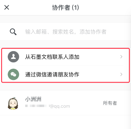 打开文档列表,找到需要添加的文件/文件夹——后方竖着的三个点——查看协作者——从石墨文档联系人添加/通过微信邀请朋友协作——所有好友,点击好友后方「添加」,选择协作者权限,确认即可,如图所示: