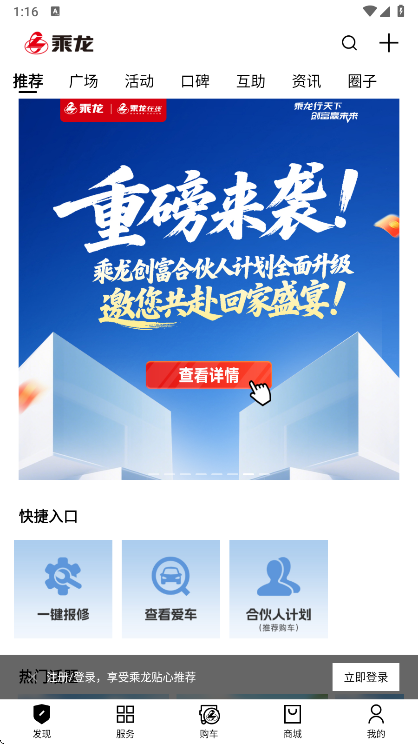 1、在本站下载安装乘龙之家app打开,进入发现页