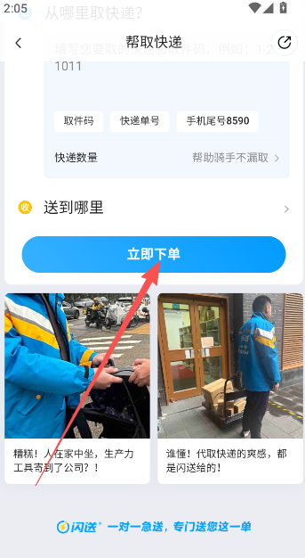 3、输入要取的快递单号和取件码,点击立即下单。