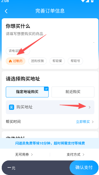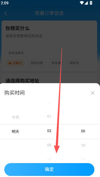 2、完善订单信息:商品名称类目、购买地址以及帮买时间等(也就是预约配送的时间)。
