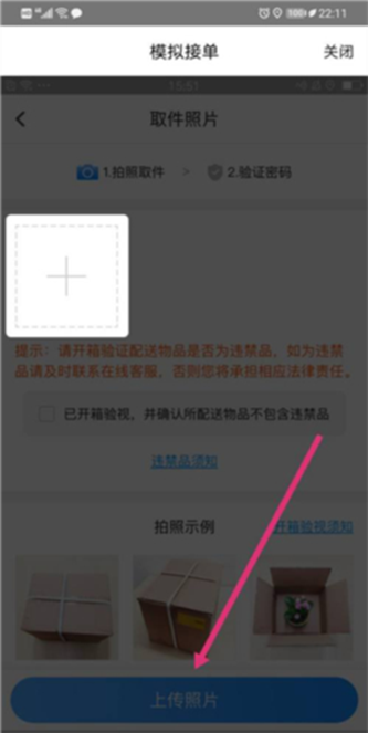 3、上门取件,点击我已就位,点击验证取件,对配送物品拍照并上传物品照片(物品要拍全,二次包装的物品,开箱验货拍物品本身,不要只拍外包装,封口的餐饮订单拍两张,一张小票照片,一张物品和小票的组合照要拍全)。