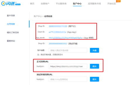 4、点击【账户中心】——【应用信息】,即可获取红色方框的参数,填写到商城后台即可。