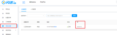 5、获取店铺id,在闪送商家端可以获取,红色方框的就是店铺id了https://seller.ishansong.com/shopmanager/list。