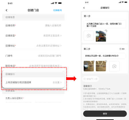 2、如果您准备注册闪送商家账号:创建门店时,添加【店铺指引】上传店铺指引和店面招牌即可开通该功能。(如下图所示)