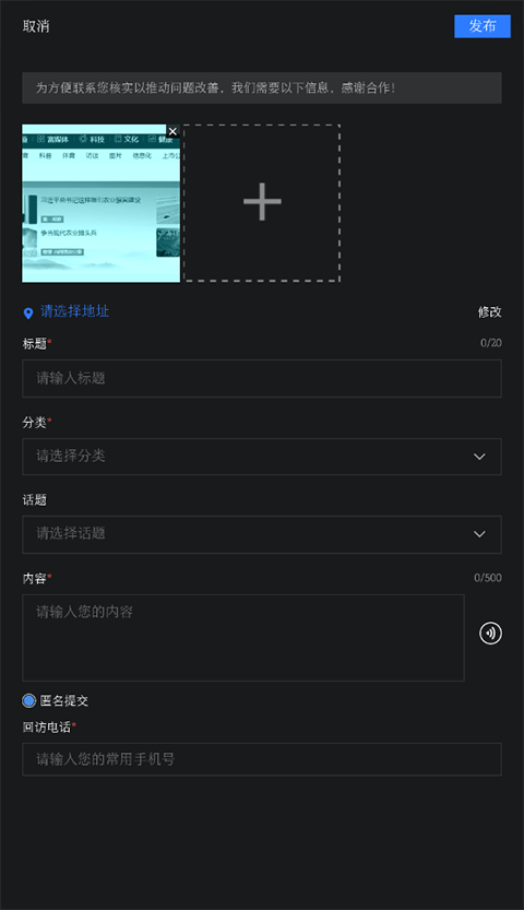 2、用相机拍下你想要反映的问题,并配上你想要表达的问题内容、标题、以及电话等信息后,点击发布即可。