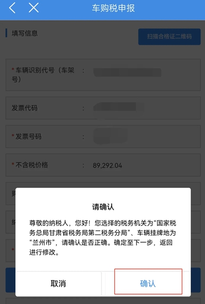 2、填写车辆识别代号(车架号),自动带出发票代码;填写发票号码,填写不含税价格,点击下一步,弹出如下提示框;