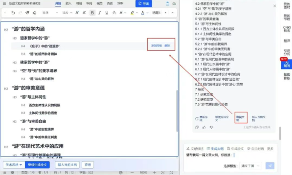 大纲完成后可以点击【继续生成全文】,一键生成论文全文内容。此外,支持文档内容上的AI缩写、扩写、改写、润色;还可以添加阅读中整理的笔记和引文摘录等写作素材,进行论文的补充,同时系统会自动生成参考文献。