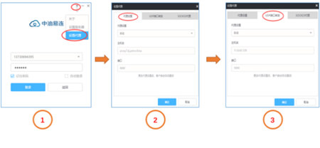 PC客户端设置代理方法:在登录界面,点击右上角的“倒三角”——“设置代理”分别进行“代理设置”和“UDP端口转发”设置。