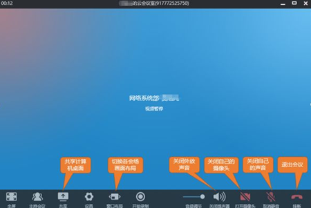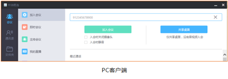 PC端:会中可以通过“静音”按钮关闭自己的声音,通过“挂断”退出会议,通过“打开/关闭摄像头”控制是否显示自己的摄像头画面,通过“共享”,共享计算机桌面,实现PPT等资料的演示。