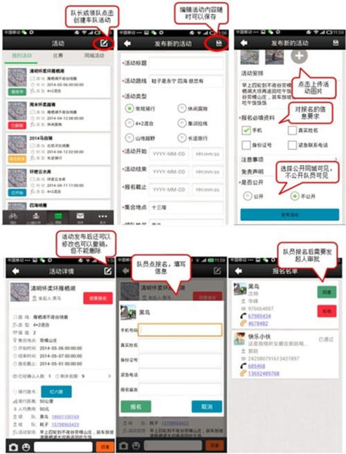 共享路书,组织者提前在手机上准备好路书随活动一同发布,队员可以查看并保存本地