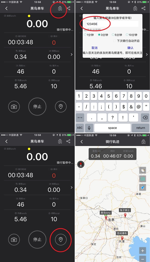 启动骑行后,点右上角图标,输入自定的六位黑鸟频道号,就可以开始上报位置了,同时可以看到队友位置。