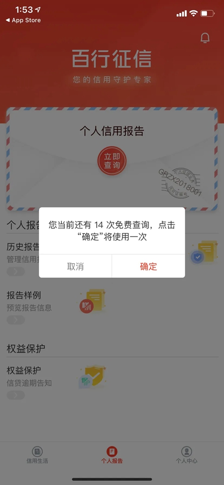 2、点击个人报告,选择立即查询,会显示剩余免费查询次数。