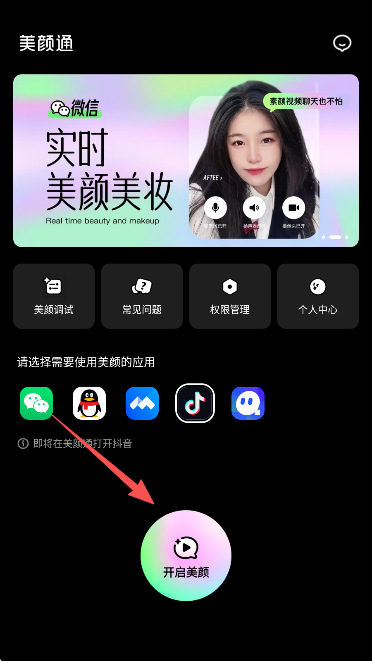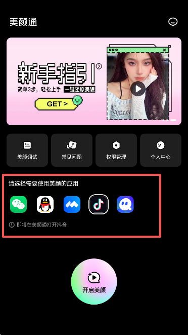 1、在本站下载安装美颜通app打开,您可以选择要使用美颜的应用