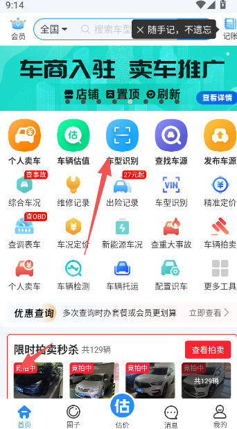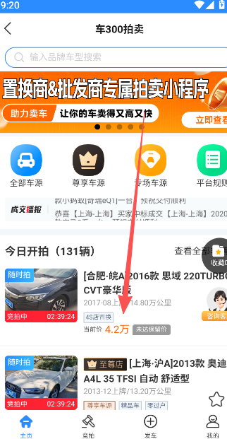 1、点击车300专业版首页功能栏目展示车辆拍卖功能。