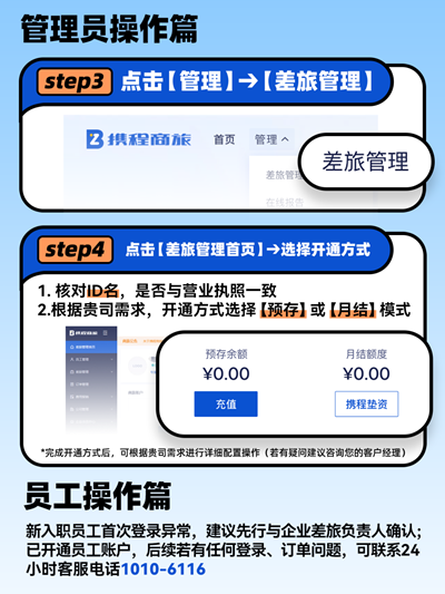 Step4:开通差旅服务,核对公司ID是否和营业执照一致,按需选择【预存】或【月结】模式 (不清楚的可咨询您的专属客户经理哦~)