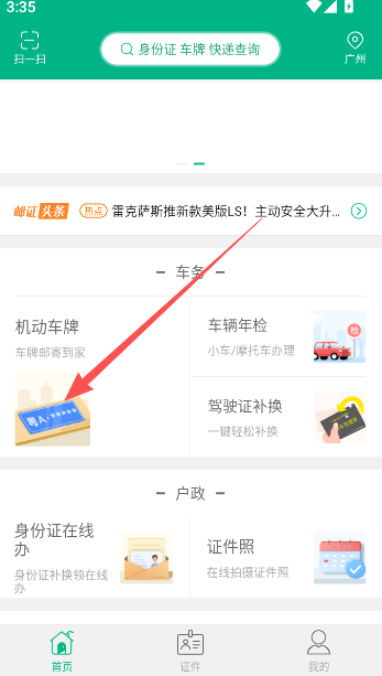 4、注册成功以后,可在首页选择对应业务,在线申请办理,比如身份证、机动车牌或是车辆年检等。