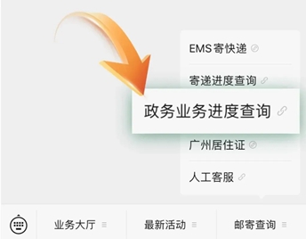 3、关注后,点击公众号底部菜单栏右下角的 “邮寄查询-政务业务进度查询” 选项。