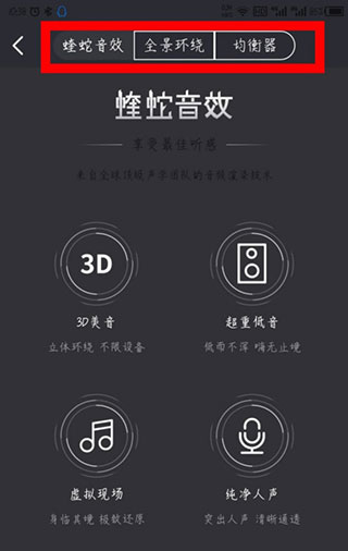 4、然后能看到顶部的菜单选项,可以选择蝰蛇音效全景环绕和均衡器。如图所示