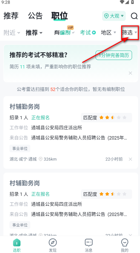 1、进入公考雷达app,点击上方右边的【各地考试】。
