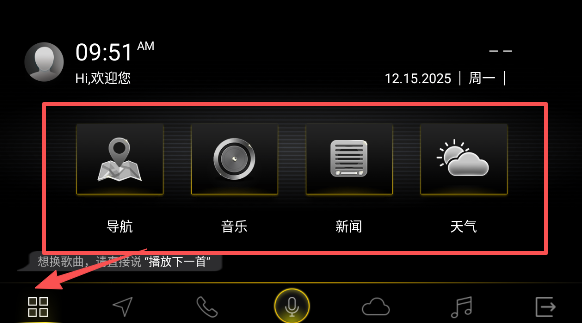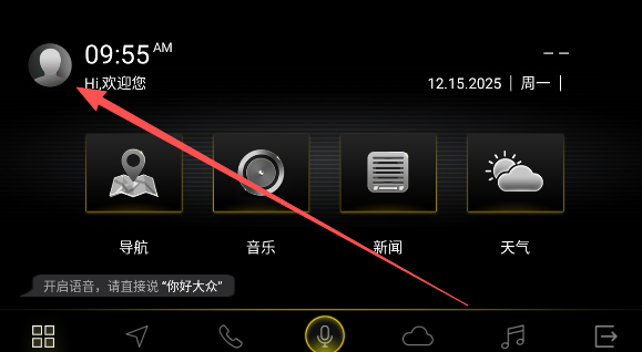 1、首页,可查看导航、音乐、新闻和天气四个部分,可用于汽车互联实时查看。