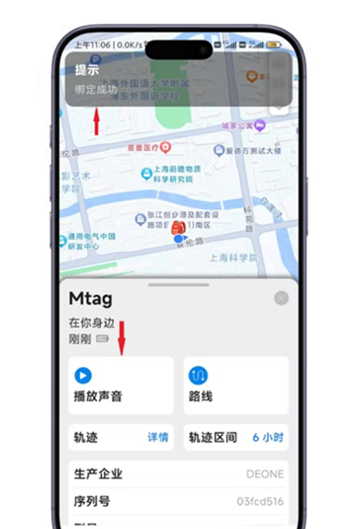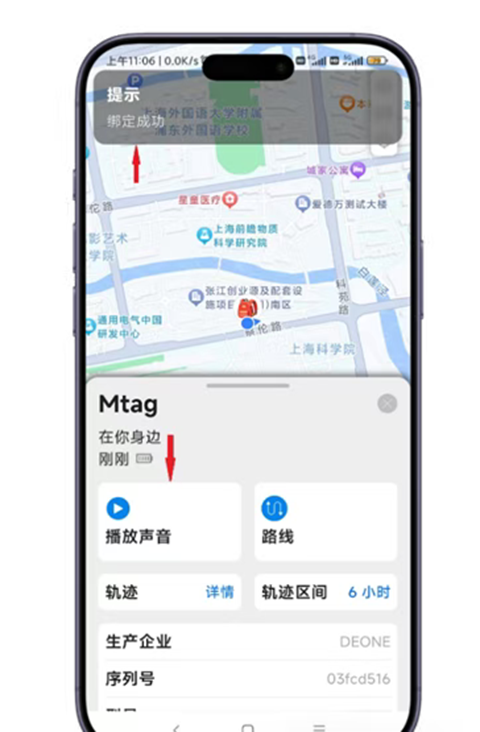 开机:抽出白色塑料垫片,听到清脆的提示音后,即可打开手机“FINDME” App,搜索绑定Mtag。