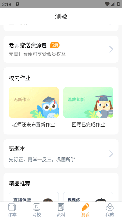 5、在测验模块可以看到老师发布的新作业,也可以进行自我测验;
