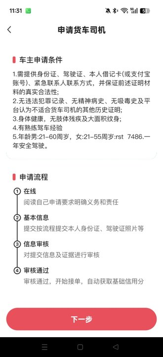 2、完整阅读查看申请货车司机的入驻条件文字规则。