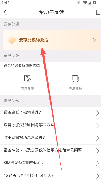 2、进入帮组与反馈页面,点击云存兑换码激活。