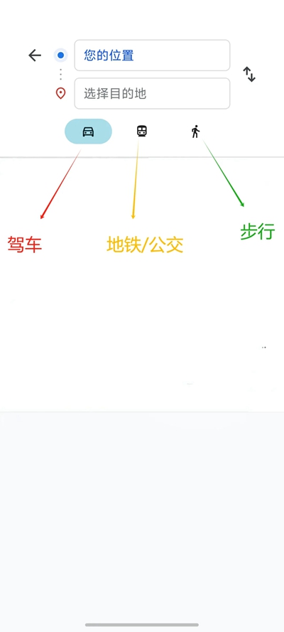 如下图,点击蓝色箭头所指位置是用来导航的。有驾车/地铁/公交/步行等方式。