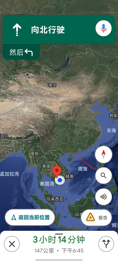 如果旅途中突然想经过某个地方时,可在具体导航界面点击红色箭头指向的放大镜图标,进行选址