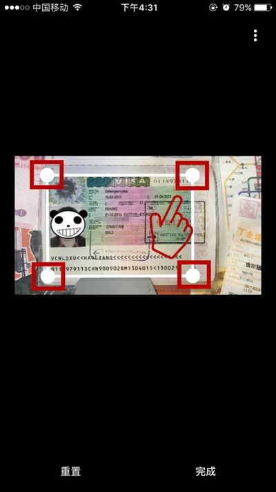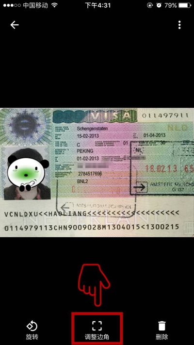 No.4:有时候初步的合成品,就已经OK,可以拿去用了(你可以看到,原本有点弯曲的Visa页几乎扫成了平面,优化效果还是很明显的)。但是如果你对一些边边角角还不够满意,可以选择“调整边角”,继续深加工。