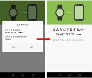 (1)打开Android Wear中国版app,跟随app的屏幕提示操作。点击命名为HUAWEI WATCH XXX的配对码通过蓝牙连接完成手机和手表的配对、同步。如手机的蓝牙开关未开启,app会自动提示开启。PS:再次提醒不要在“手机-设置-蓝牙中“去直接搜索和配对连接!千万记住。
