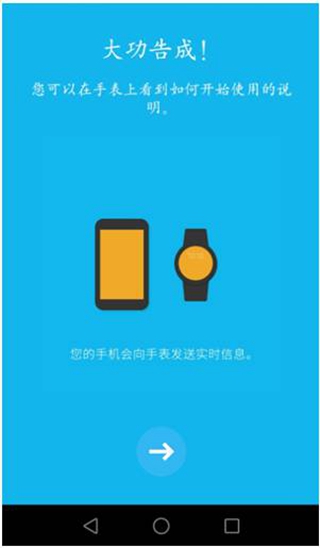 (2)Android Wear中国版app提示“大功告成“,则表示配对连接完成。同步完成后请跟随手表屏幕提示滑动手指,学习常用手势和基本操作。注意:在配对完成之前,不要进行任何操作,确保配对过程正常结束。若更新时间较长,请耐心等待。配对完成后需要按照提示手势把手表上的卡片全部划掉,避免影响消息通知在手表显示。如何,嗖嗖的就搞定了有木有?