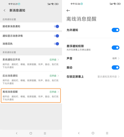 回到 我的>消息通知点击“离线消息提醒”,将打开App的系统的 “离线消息提醒” 设置,请打开其中的所有消息提示功能。