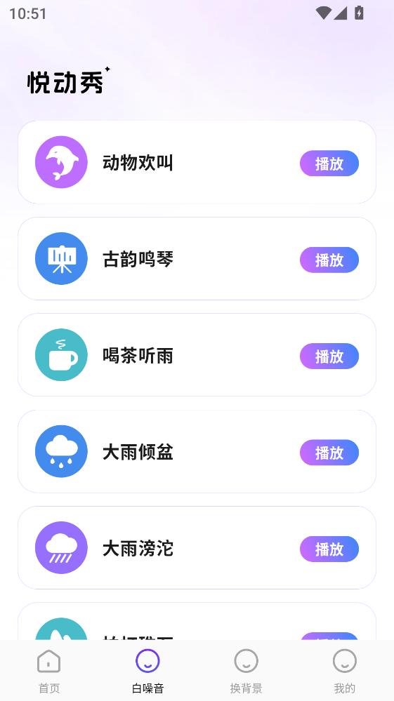 3、提供雨、风、浪等各种类型的白噪声,帮助用户在不同场景(如工作、学习、休息)中快速进入专注或放松状态!
