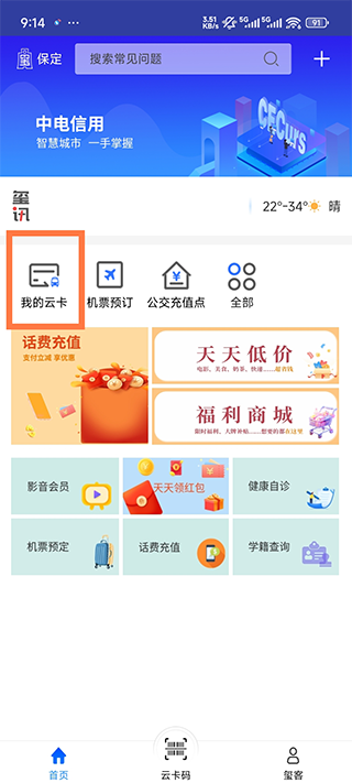 3、如果你想充值公交卡点击我的云卡进行充值,还能二维码乘车